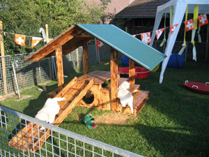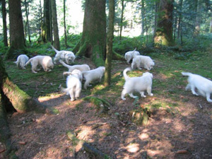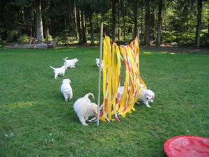 Our bitches give birth at home in familiar surroundings and the pups can stay there for 3–5 weeks depending on the season. Afterwards it's into the garden that we habe turned into an adventure playground with many acoustic and visual toys and they have access to our house where there is always something interesting to see an hear. After the first vaccination at 8 weeks it's off on the first car trip usually with a short walk in the woods with the puppies' future owners.